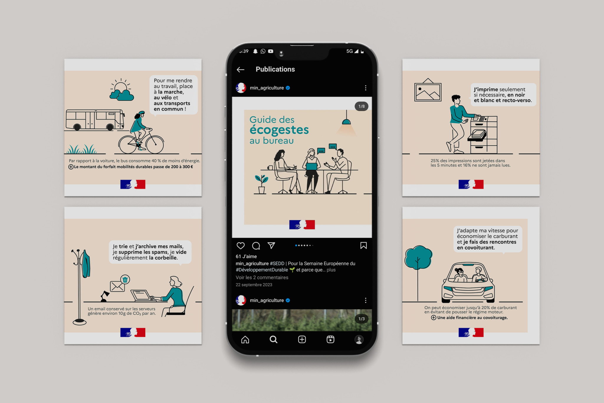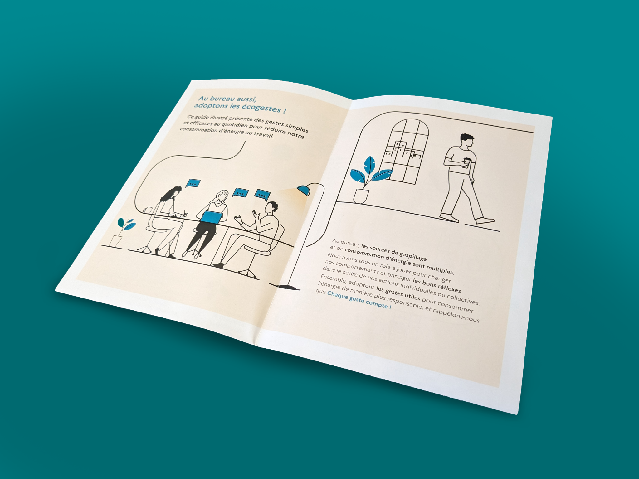 Dans le cadre de la campagne “écogeste” du Gouvernement, j’ai imaginé un kit de communication sous forme de bande dessinée. Ce format ludique a guidé les agents dans l’adoption des écogestes au travail.