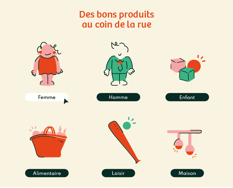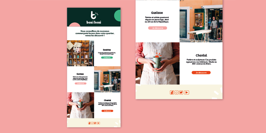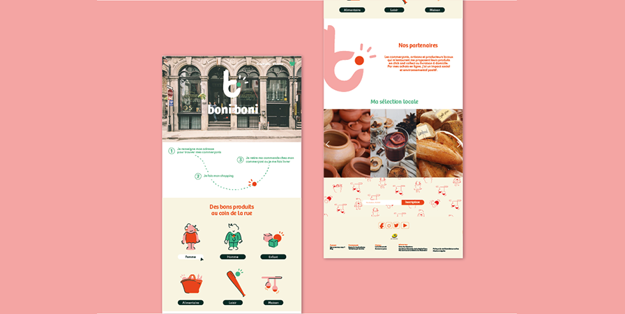 Création d’une nouvelle identité de marque pour le e-shop des artisans locaux : ma ville, mon shopping. L’idée était de jouer avec l’image de la pépite, le produit rare et artisanal, que l’on peut trouver sur le site commerçant boni boni.